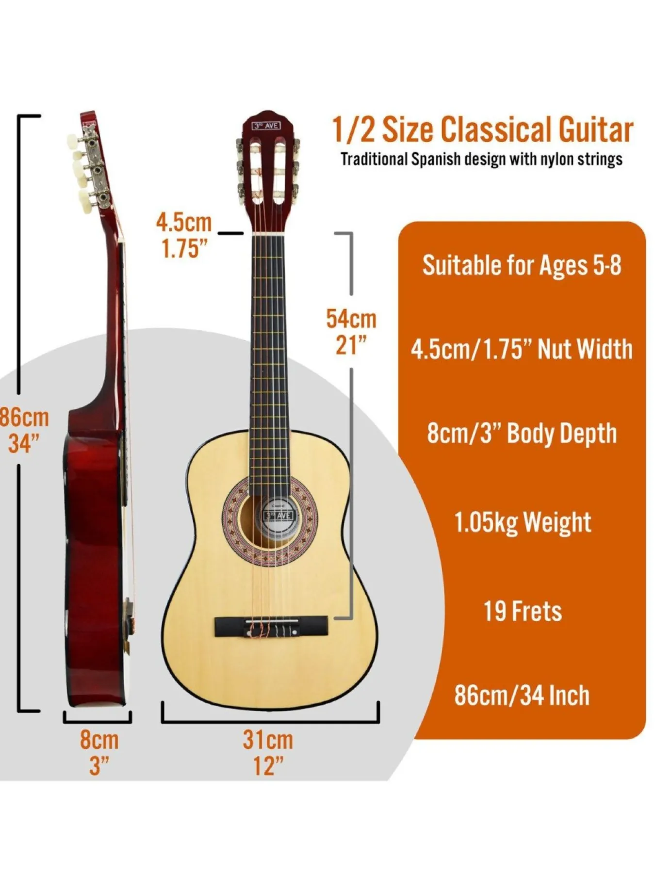 3Rd Avenue 1/2 Size Classical Guitar Pack – Natural With Free Online Music Lessons