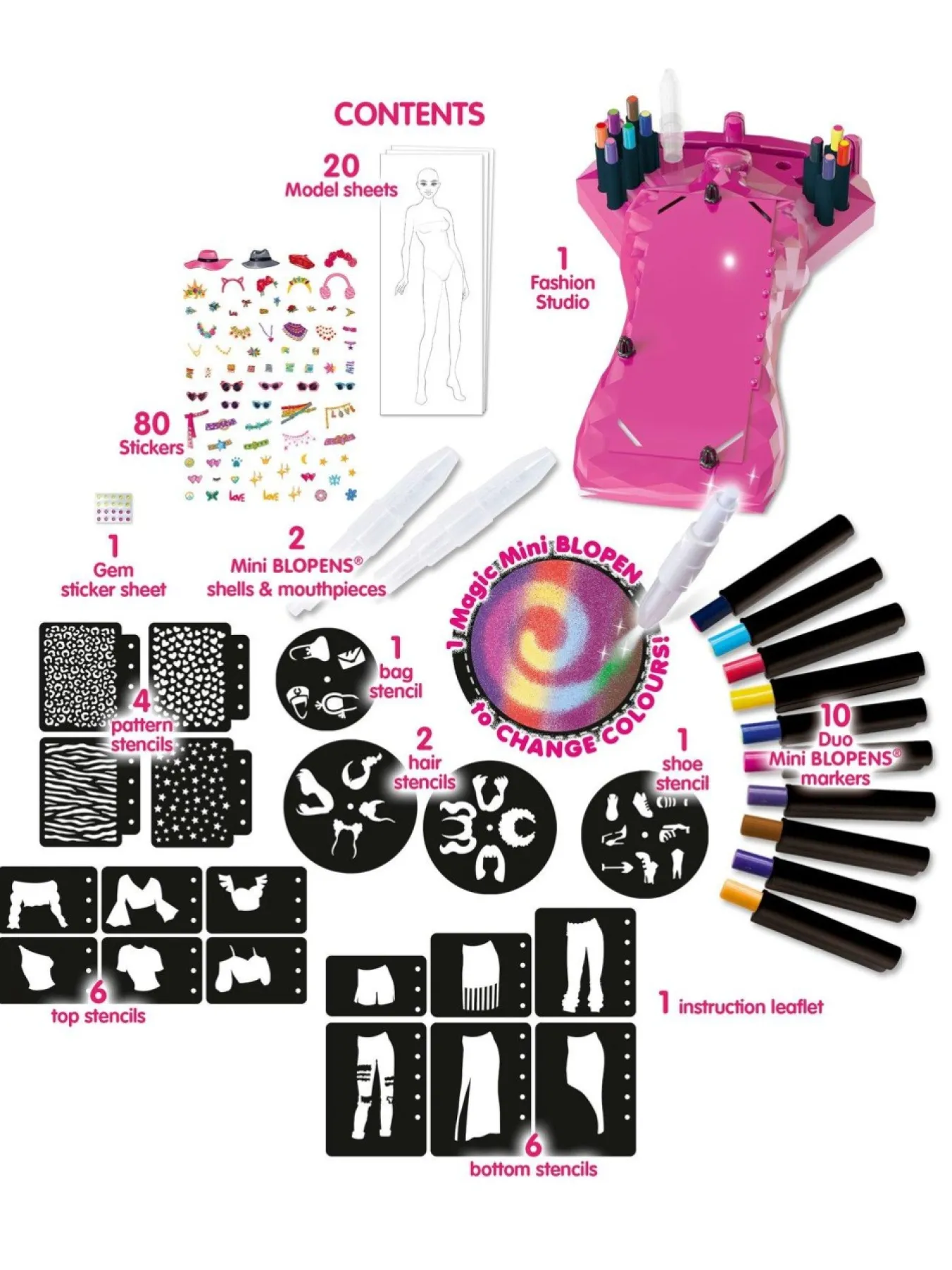 The Blopens Fashion Studio Will Give Any Budding Designer Hours Of Fun Trying Out Their Fashion Stylist Skills, With Over 1,000 Possible Design Combinations! Using The Stencils, Choose Different Hair Styles, Tops, Bottoms, Shoes And Accessories And Colour Them In Using Your Blopens . You Can Even Add Different Patterns To The Outfits By Layering The Stencils And Using The Magic Colour Change Blopens ! Then Use The Sparkly Stickers And Gems To Accessorise Your Creations And Add Those All Important Final Touches! With Blopens You Can Blow In Lines And Circles, Harder Or Softer For Different Airbrush Type Effects And Then Use The Same Pens To Colour-In Extra Details.