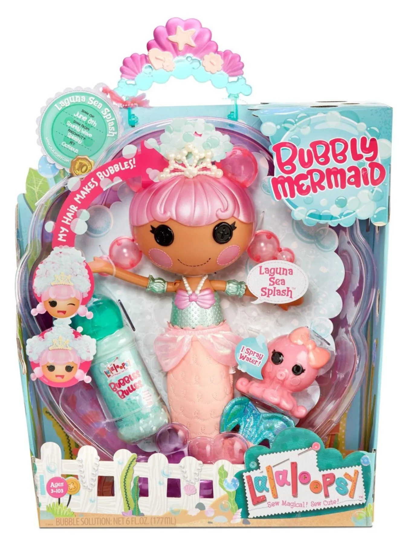Just Add Bubble Solution To Doll And Squeeze, And Laguna Sea Splash Grows Bubble Hair! Her Pet Octopus Squirts Water Too. Includes Shell Tub For Water Play Anywhere, Bubble Solution And More. Makes A Wonderful Gift Too.