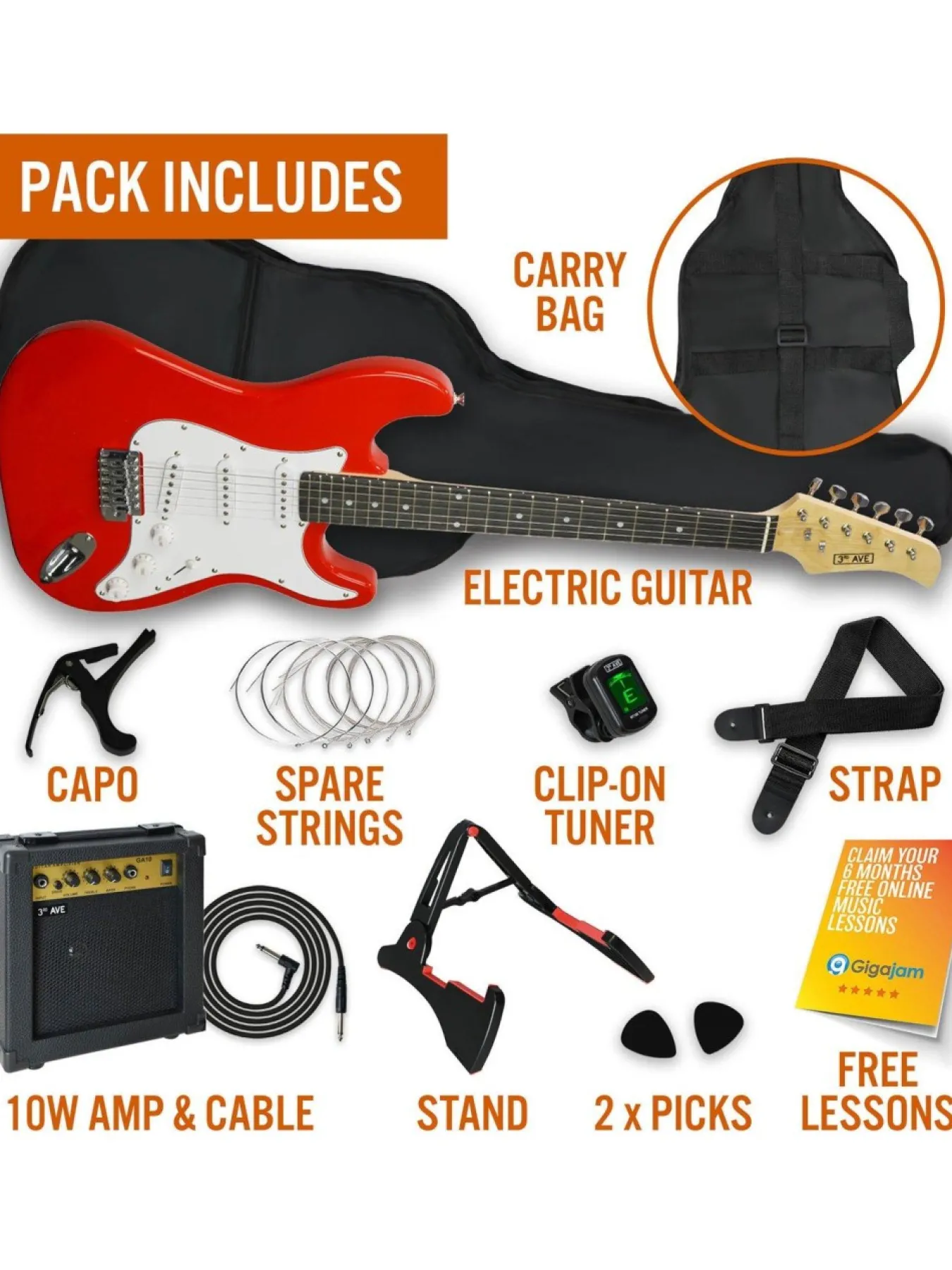 This St Style Guitar Is A Classic Looking Electric Rock Guitar In True Apple Red. It Even Has The Contrasting Scratch Plate For Effect. Although The Guitar Has Been Designed For Beginners, There Has Been No Compromise On Quality. This Affordable Guitar Has A High Quality Redwood Fret Board And Features A Beautiful Maple Neck. The Guitar Has A Wide Bridge With 22 Frets. The Guitar Produces A Well Rounded Tone From The 3 Single Coil Pickups. Take Control Of Your Sound With Tone And Volume Controls, And Add Some Effect With The Whammy Bar. This Premium Pack Includes A 10W Amp, Tripod Stand, Capo, Strap, Tuner, Picks, Spare Strings, Cable And Whammy Bar. In Your Order Will Be A Postcard With Instructions Of How To Redeem Your Free Music Lessons, Study For Your Music Grades With Gigajam. Available For Guitar, Bass, Keyboards And Drums Up To Grade 5.