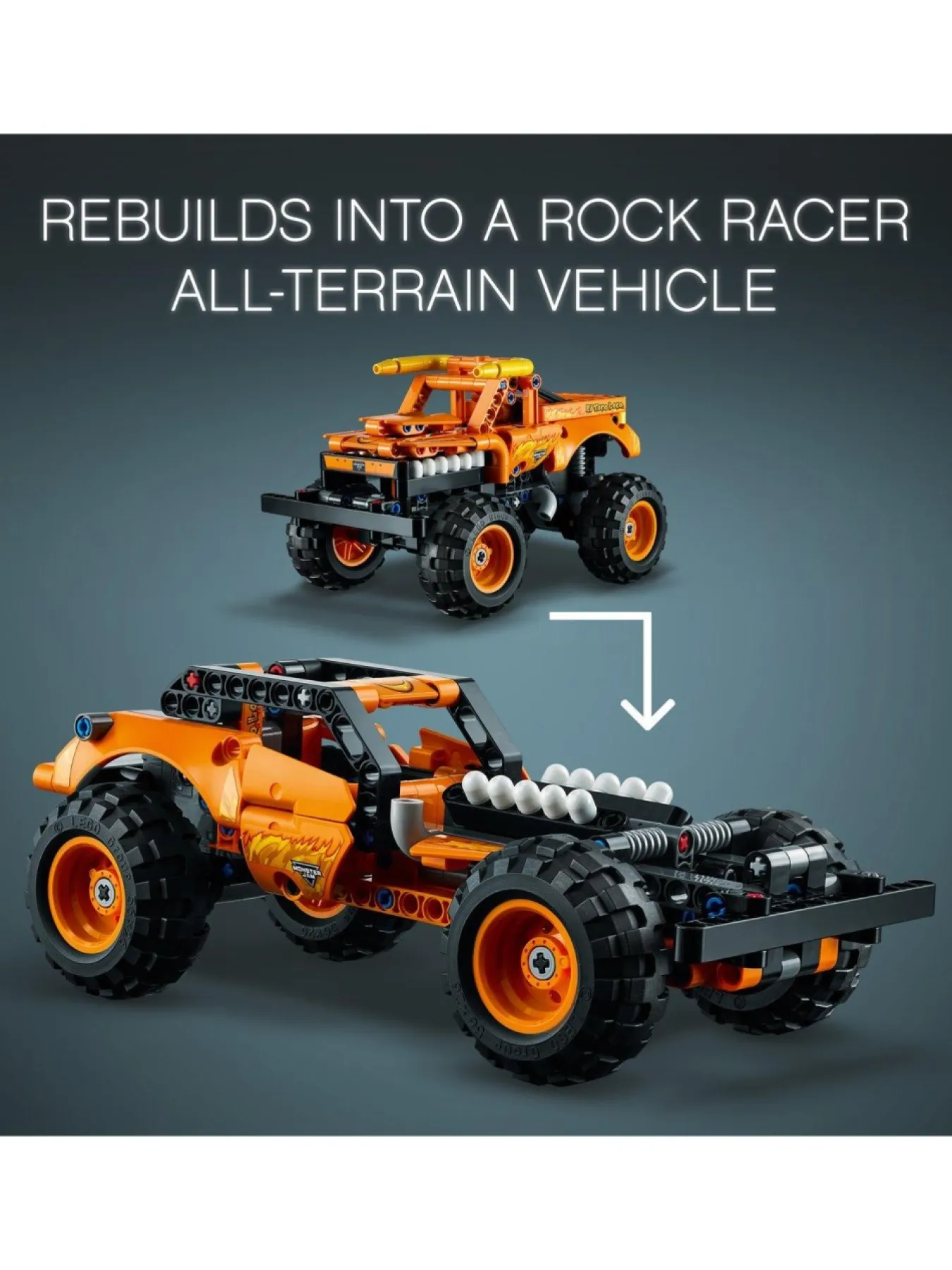 An Exciting 2-In-1 Set For Monster Truck Fans, Featuring A Lego Technic Monster Jam El Toro Loco Truck That Rebuilds Into A Rock Racer.
