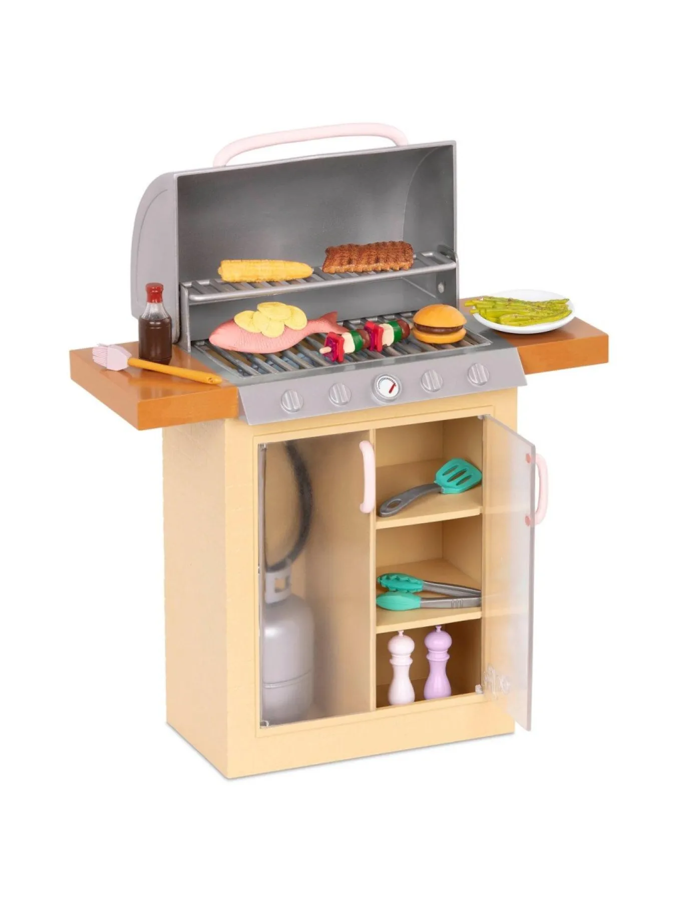 Which Of Your Dolls Will Be The Chef Today? Open Up The Lid Of The Backyard Grill Set And Start Cooking With The Play Food Choices. They Have Realistic Details For More Pretend-Play Foodie Fun! Place The Beef Patty And The Fish On The Bottom Grill With The Spatula, Then Use The Basting Brush To Spread Bbq Sauce On The Rib Rack – Yummy! Prepare A Side Of Corn On The Cob On The Top Grill And Add A Dish Of Veggies With The Asparagus To Create A Full Course Meal! When It’s Time To Dine, Organise Your Cooking Station By Placing The Utensils On The Storage Shelves For A Neat And Tidy Cleanup. Grilling Up Meals Is Easy With The Right Barbecue!